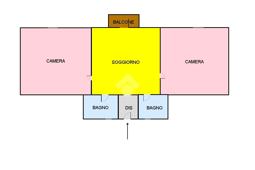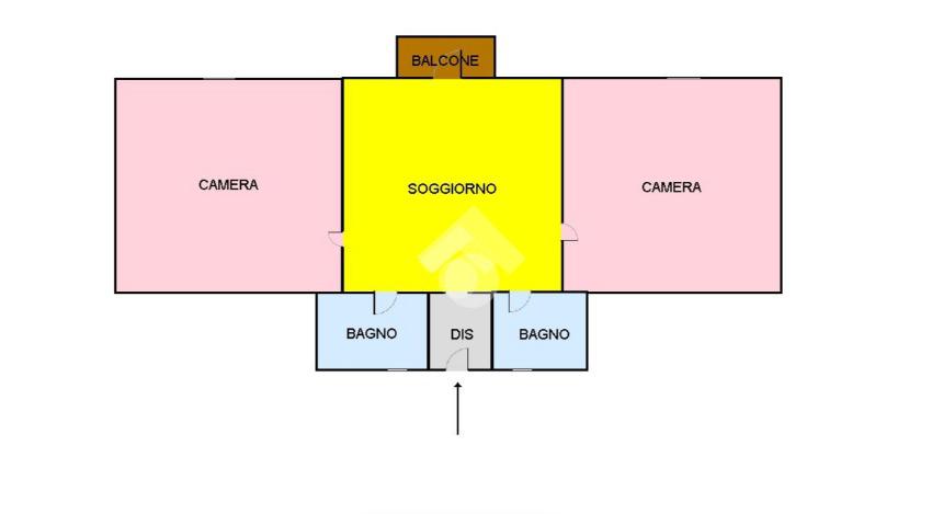L'appartamento è composto da un disimpegno, due bagni, di cui uno dotato di vasca e l'altro dotato di piatto doccia, due camere da letto, ed infine, un ampio soggiorno-cucina con balcone.